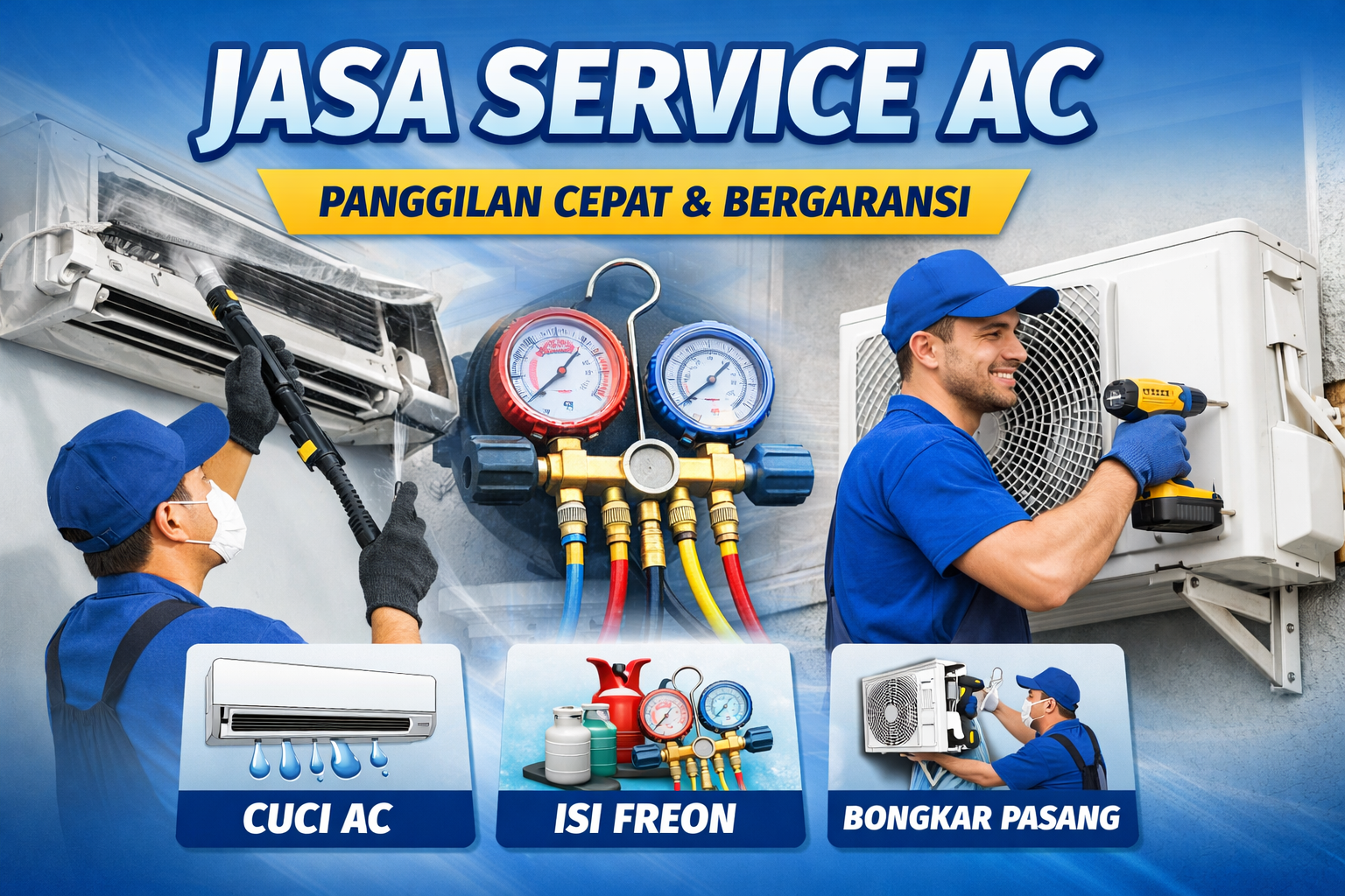 Kami melayani service AC rumah, kantor, ruko & apartemen. Teknisi profesional, rapi, dan bergaransi.